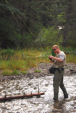 Fishing was a small wonder. I grabbed the wrong contacts for my eyes, and I was all but blind after we arrived in Red River. Try tying a fly knot blind. I did catch about four trout, but every time I lost my fly, it took about 45 minutes to secure a new one.